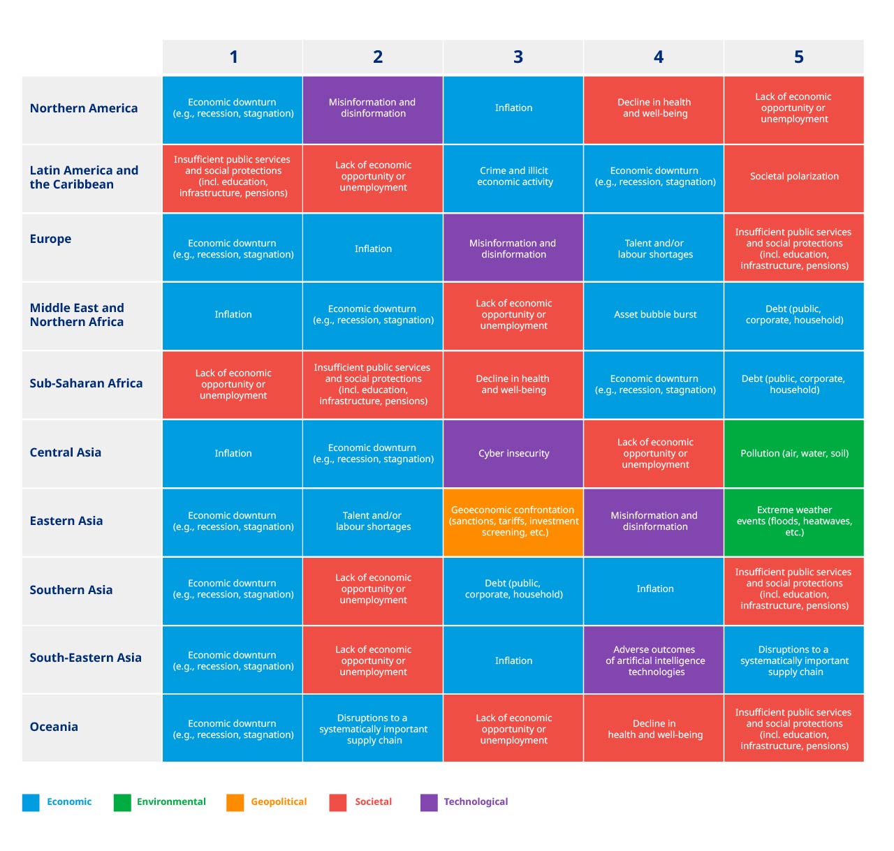 - With household costs mounting, businesses and governments under financial pressure, and labor markets in a weakened state, “economic downturn”, “lack of economic opportunity or unemployment”, “inflation”, “insufficient public services and social protections,” and “debt” feature heavily among the top five risks globally.